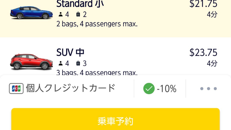 乗車予約ボタンを押下する前に、下記画像のようにクレジットカードの横の部分が10%引きになっているかしっかり確認!私が初めて使用したときは、設定ミスでこの割引が適用されませんでした(泣)